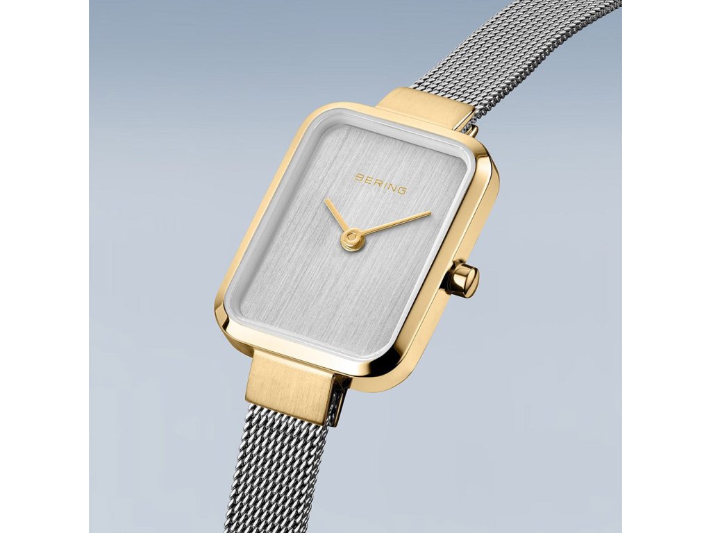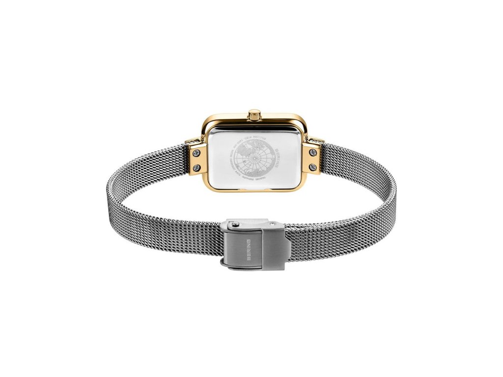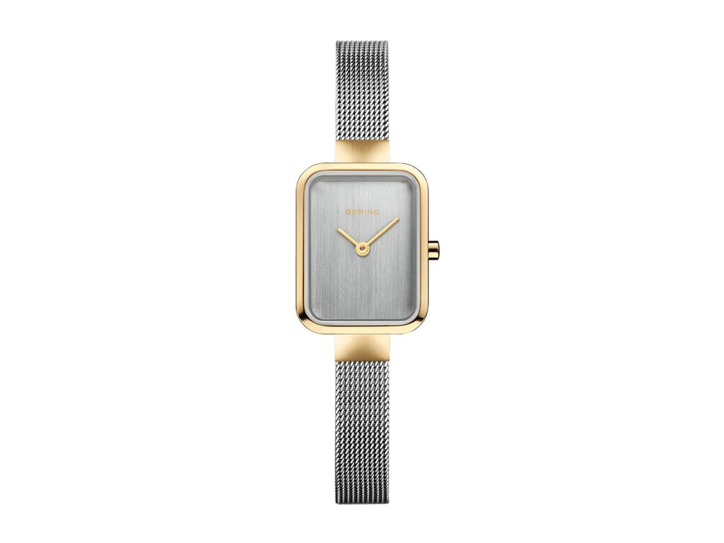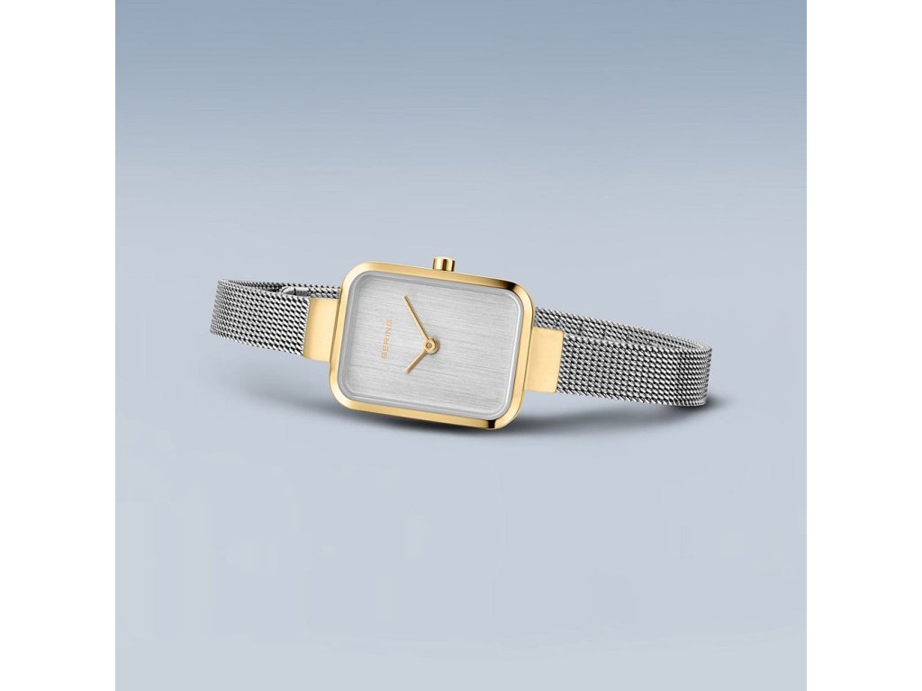 Na stříbrném číselníku září štíhlé ručky ve zlaté barvě. Číselník je chráněn safírovým sklem, které je odolné proti poškrábání. Obdélníkové zaoblené pouzdro je vyrobeno z nerezové oceli a pozlaceno technologií iontového pokovení (IP), která je kvalitní a stálá. Na pouzdro dokonale navazuje ocelový náramek z módní milánské pleteniny. Hodinky jsou vlhkotěsné do 3ATM.
