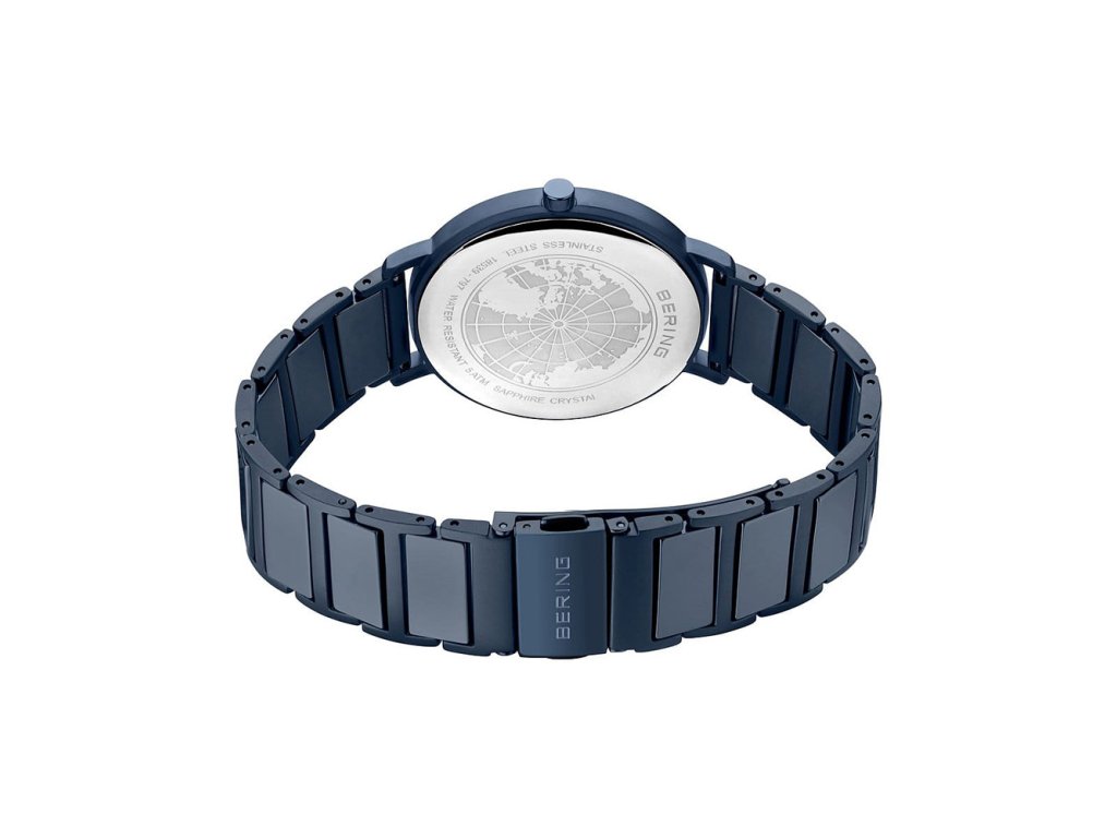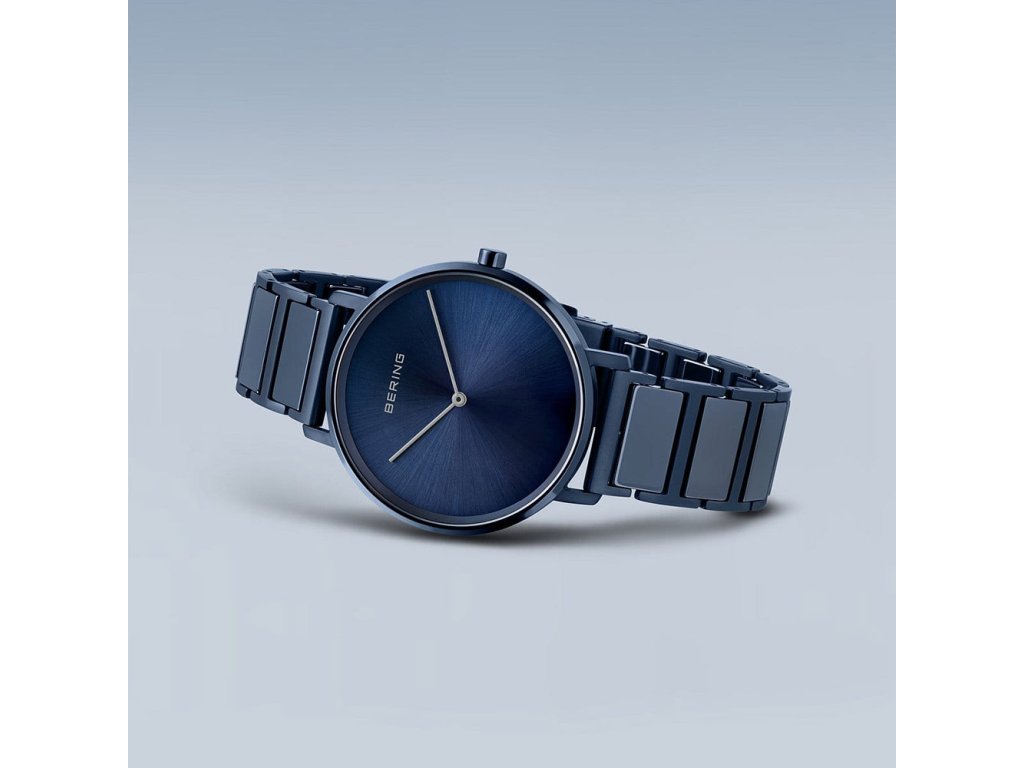 Na modrém číselníku vynikají štíhlé stříbřité ručky. Číselník je chráněn odolným safírovým sklem. Kulaté pouzdro a elegantní náramek s modrými keramickými vložkami jsou vyrobeny z ušlechtilé oceli s modrým povlakem technologií iontového pokovení (IP), která je kvalitní a stálá.