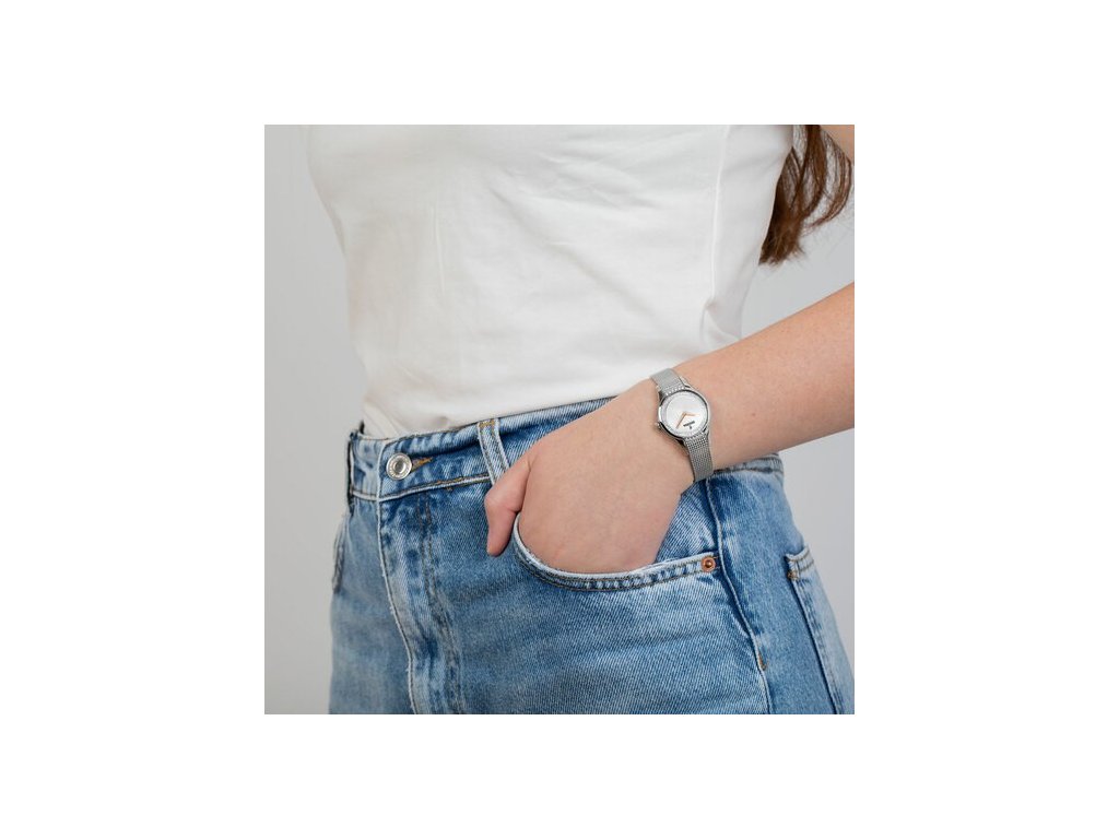 Dámské hodinky Mademoiselle s elegantním pouzdrem a drátkovým splétaným tahem z nerezové oceli okamžitě upoutají pozornost. Mají minerální sklíčko a vodotěsnost 5ATM.