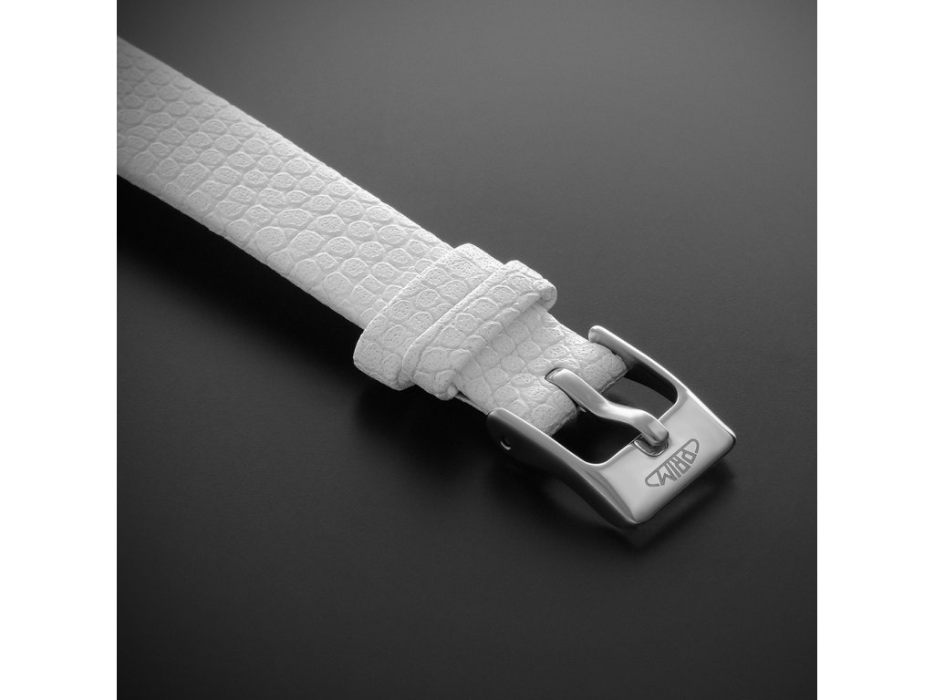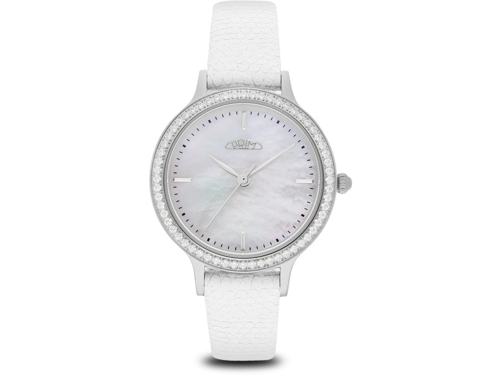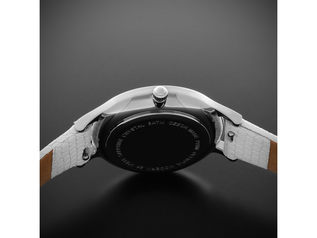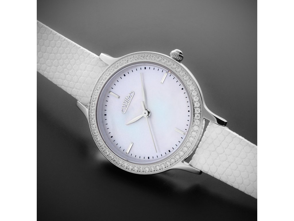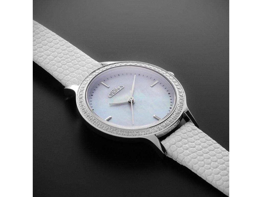 Dámské společenské hodinky Prim Olympia Modern jsou vyrobeny z nerezové oceli a doplněny o bílý kožený řemínek. Perleťový číselník je chráněn safírovým sklem s antireflexní vrstvou.