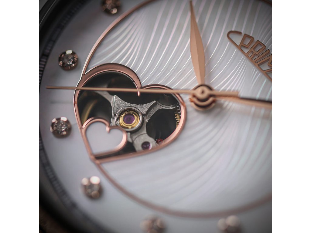 Objevte kouzlo PRIM Lady Love Elegant – dámských automatických hodinek s průzorem ve tvaru dvojitého srdce. Spojují technickou preciznost s jemnou krásou krystalů Swarovski®.