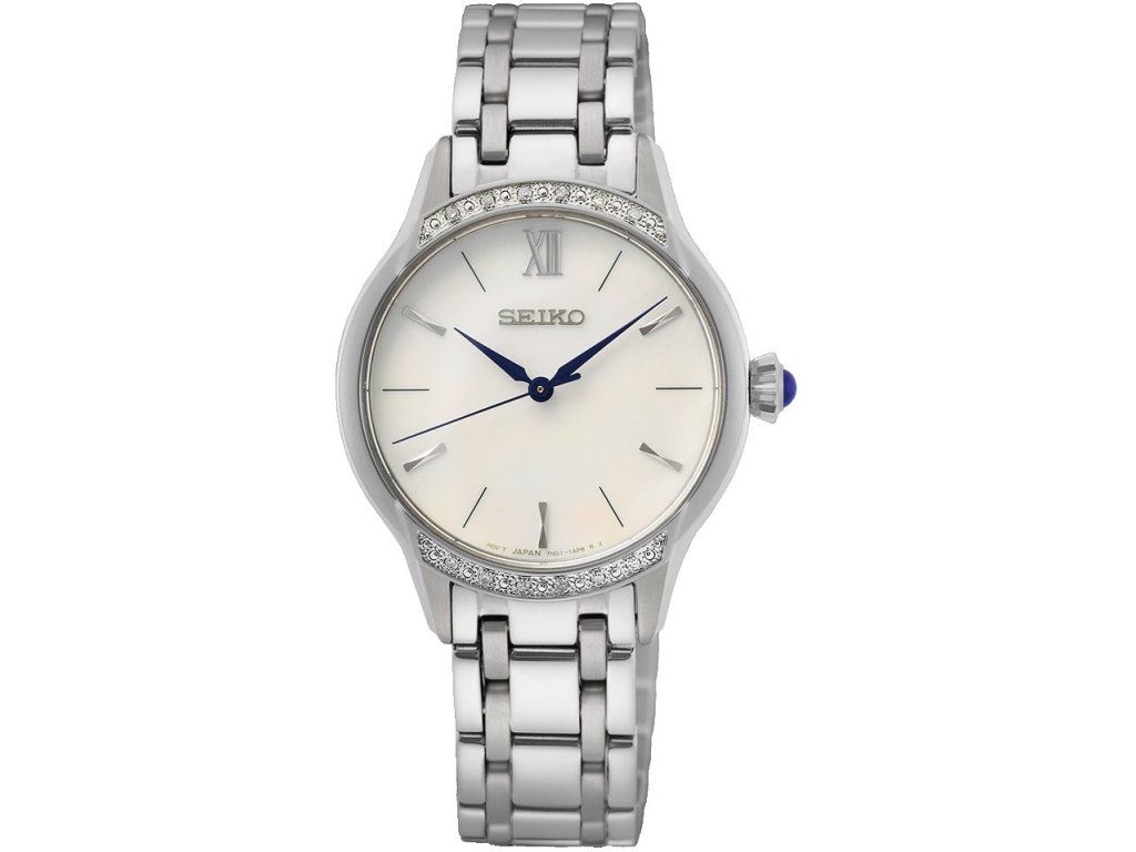Pouzdro z nerezové oceli má průměr 29,5 milimetru a část lunety osazenou diamanty. Korunku zdobí modrý kabošon, který barevně ladí s ručkami. Bílý číselník v jednoduchém designu chrání odolné safírové sklo. Pohon hodinek zajišťuje spolehlivý quartzový strojek 7N01.