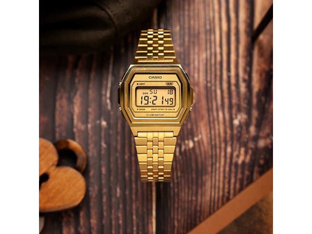 Casio Vintage A1000G-9EF jsou bateriové unisex hodinky v retro designu na ocelovém náramku s povrchovou IP úpravou zlaté barvy a překlápěcí sponou.