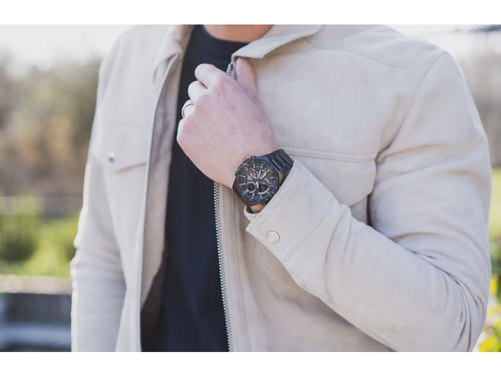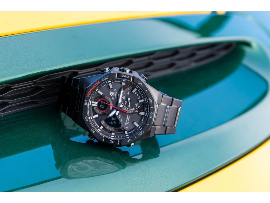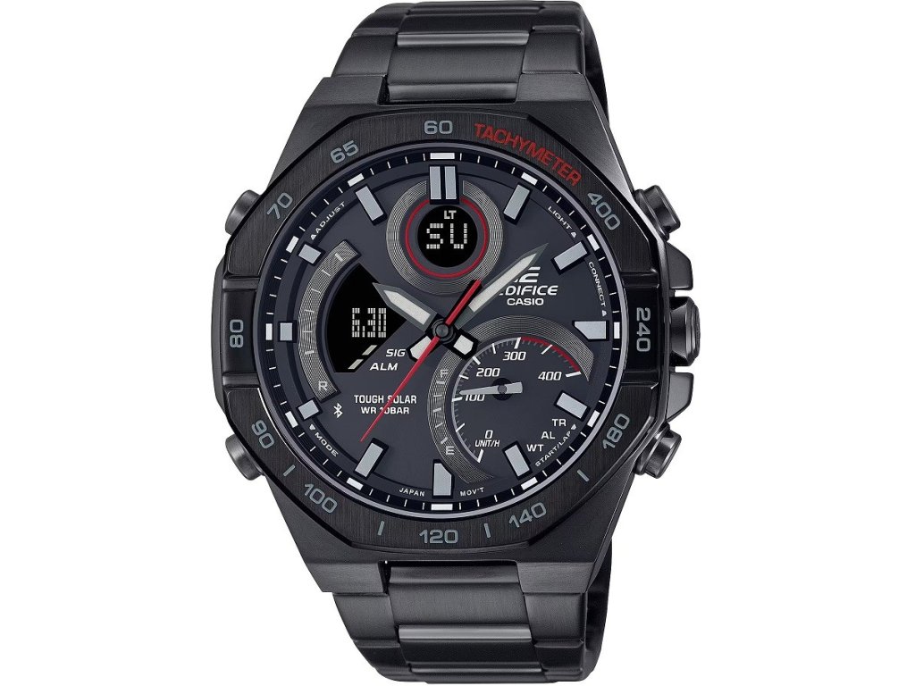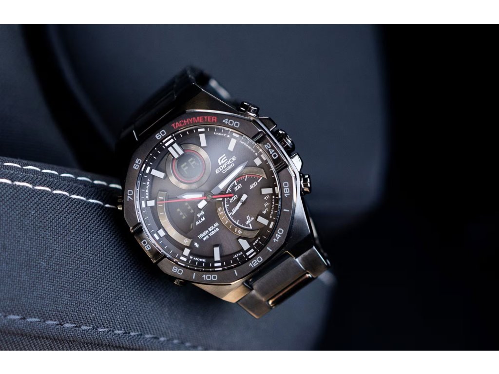 Casio Edifice ECB-950DC-1AEF jsou pánské sportovní hodinky, jejichž pouzdro o průměru 48 milimetrů vybavené pevnou lunetou s tachymetrickou stupnicí je spolu s náramkem vyrobeno z nerezové oceli s úpravou PVD.