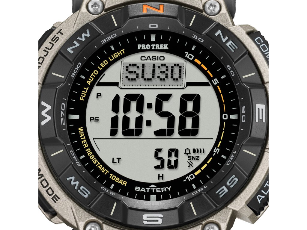 | Funkce: | Čas, Datum, Chronograf/Stopky, Alarm, Světové časy, Osvětlení, Výškoměr, Barometr, Kompas, Teploměr, Čas východu a západu, Kontrola stavu baterie |