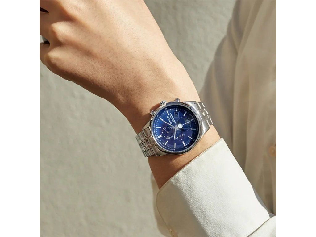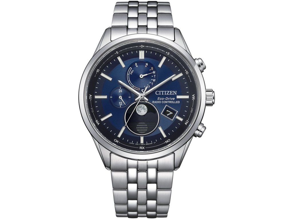 Citizen Eco-Drive Radio Controlled Moonphase jsou pánské rádiem řízené hodinky v klasickém stylu na ocelovém náramku s překlápěcí sponou.