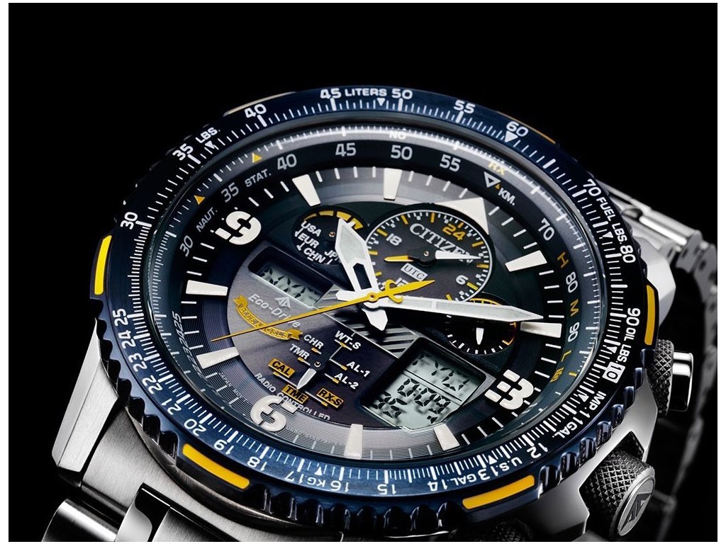 Na modrém číselníku jsou výborně viditelné masivní luminiscenční ručky a indexy. Vteřinová ručka stopek je žlutá. Digitální displeje umožňují širokou nabídku volitelných funkcí, jako jsou stopky, ukazatele data, dne v týdnu, měsíce a roku, letní čas, světové časy, časová pásma, dva budíky a dva energeticky úsporné režimy. Malé analogové číselníky slouží jako ukazatel 24 hodin a času UTC. Na obvodu číselníku je umístěna logaritmická stupnice pro letecké výpočty. Číselník je chráněn safírovým sklem odolným proti poškrábání.