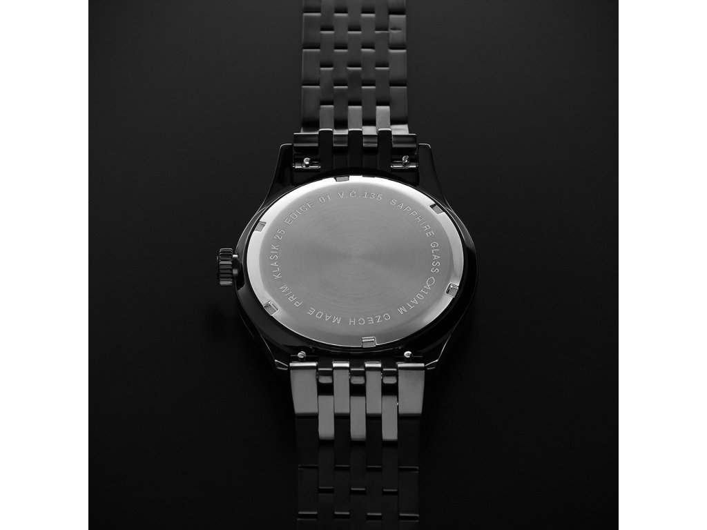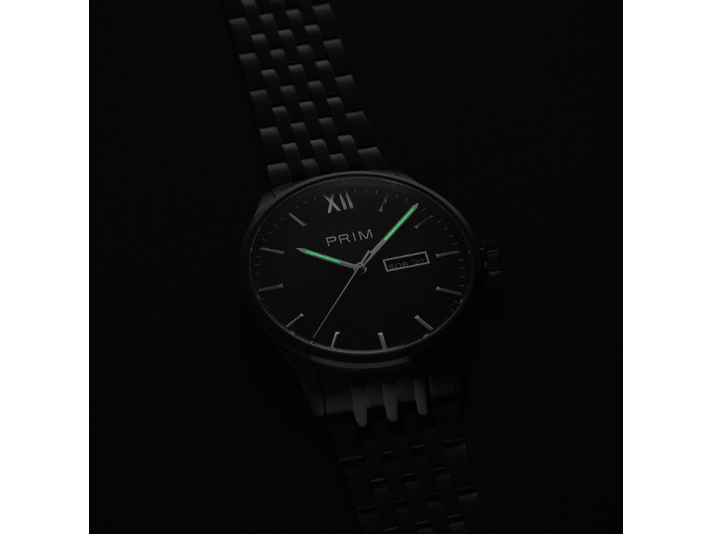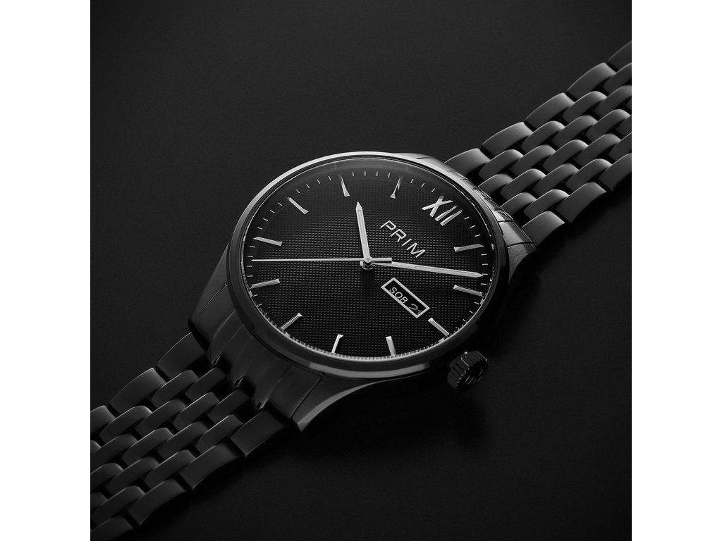 Klasické společenské hodinky PRIM Klasik 25 jsou vyrobeny z kartáčované nerezové oceli s PVD úpravou v černé barvě.