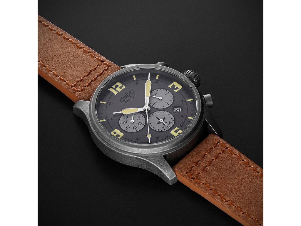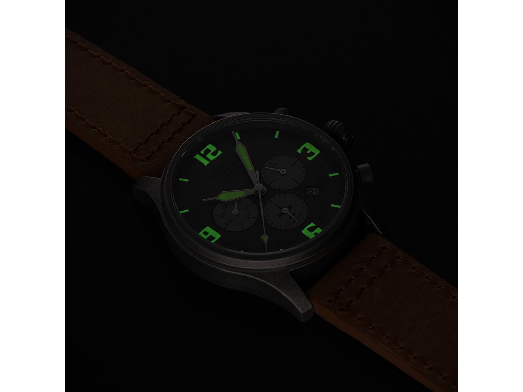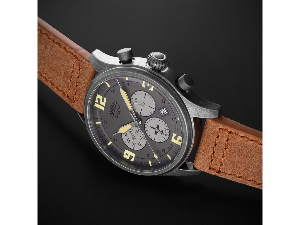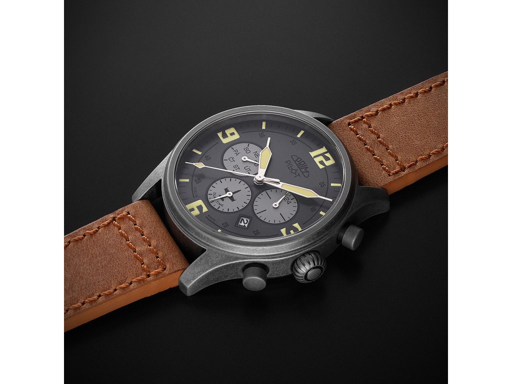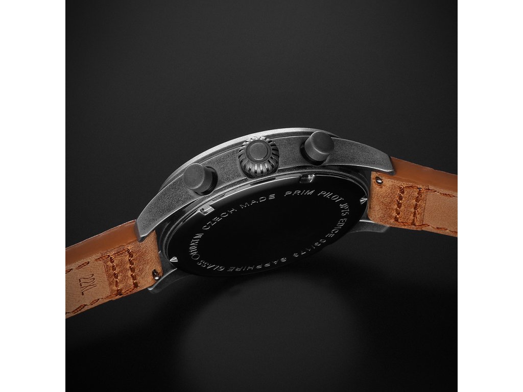 Číselníkk byl navržen s maximální pečlivostí – nabízí výrazné luminiscenční indexy, které zajišťují perfektní čitelnost i za zhoršených podmínek. V jeho středu zaujme silueta ikonického československého cvičného letounu L-39 Albatros, který jako by se vznášel mezi subčíselníky. Nechybí ani tradiční nápis PILOT s motivem příčného sklonoměru, typickým pro letecké přístroje.