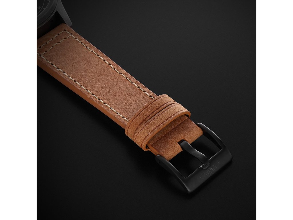 Řemínek je vyroben z robustní prošívané kůže v pilotním stylu, který perfektně doplňuje letecký charakter modelu.