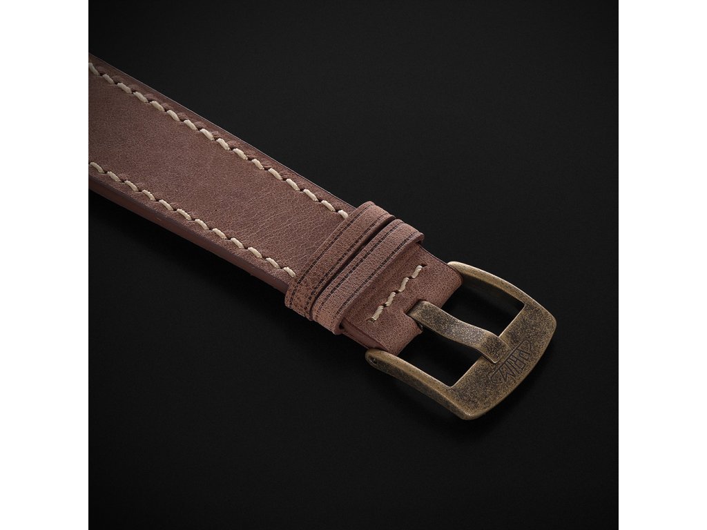 Řemínek je vyroben z robustní prošívané kůže v pilotním stylu, který perfektně doplňuje letecký charakter modelu.