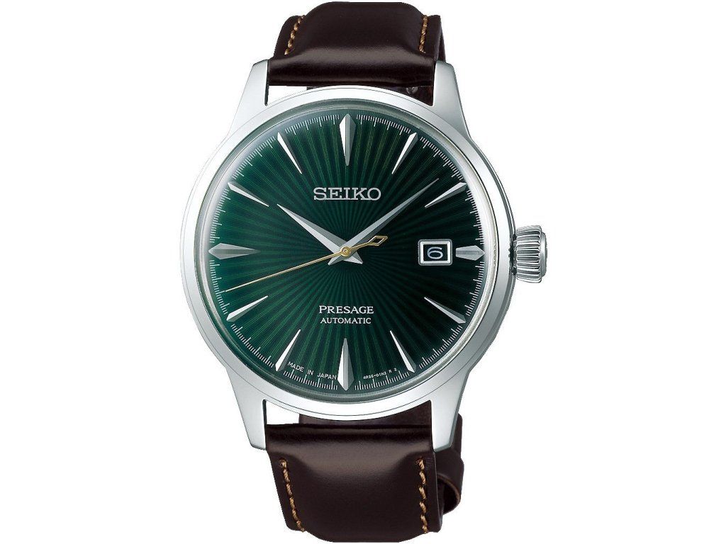 Pánské automatické hodinky Seiko Presage Cocktail Time Mockingbird na koženém náramku s překlápěcí sponou.