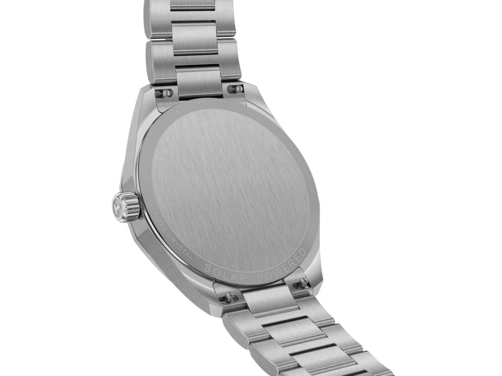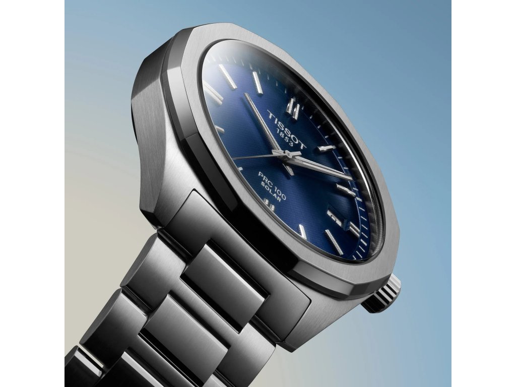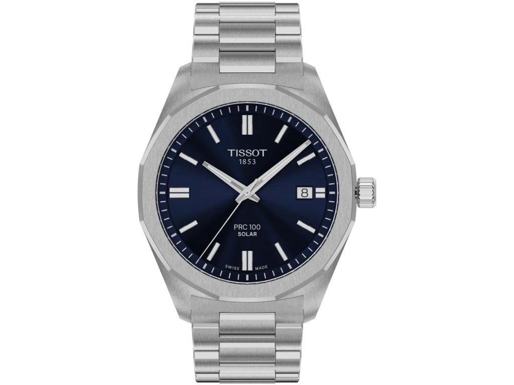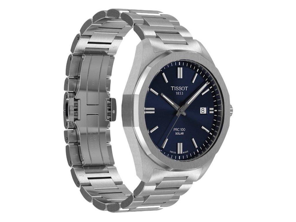 Tissot PRC 100 Solar - pánské hodinky, klasický styl. Mají ocelový náramek s motýlkovou sponou. Pouzdro z nerezové oceli o průměru 39 milimetrů má v tomto případě tmavě modrý číselník s ukazatelem data. Vše chráněno odolným safírovým sklem. Ručičky a indexy jsou potaženy luminiscenčním vrstvou Super-LumiNova®, ta garantuje perfektní čitelnost i za zhoršených světelných podmínek. Hodinky pohání strojek F06.615 se solárním napájením a funkcí indikace slabé baterie EOE (End of Energy). Díky funkci EOE se bude sekundová ručička posouvat v intervalech po 4 sekundách, což značí, že strojek potřebuje světlo. S vodotěsností 10 ATM jsou hodinky vhodné pro plavání.