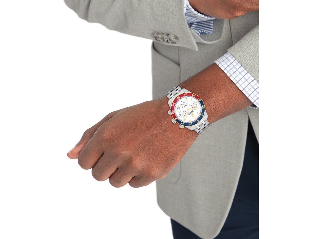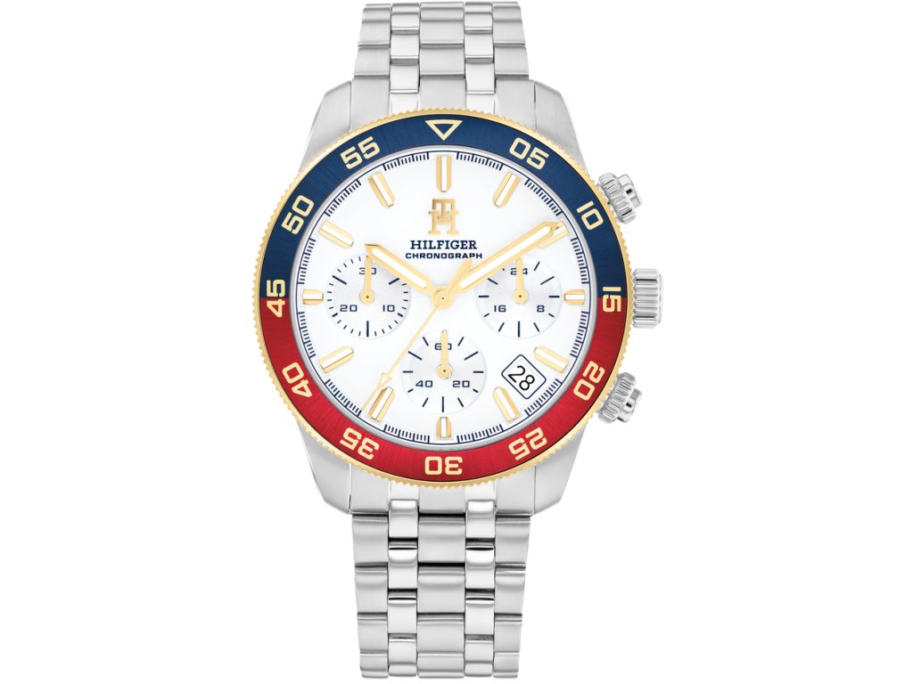 Hodinky Tommy Hilfiger mají bílý číselník se zlatými detaily, který upoutá pozornost výraznými ručičkami, třemi chronografy s funkcí stopek, praktickou datumovkou a nepřehlédnutelným logem značky. Pouzdro i tah jsou zhotoveny z kvalitní nerezové oceli.